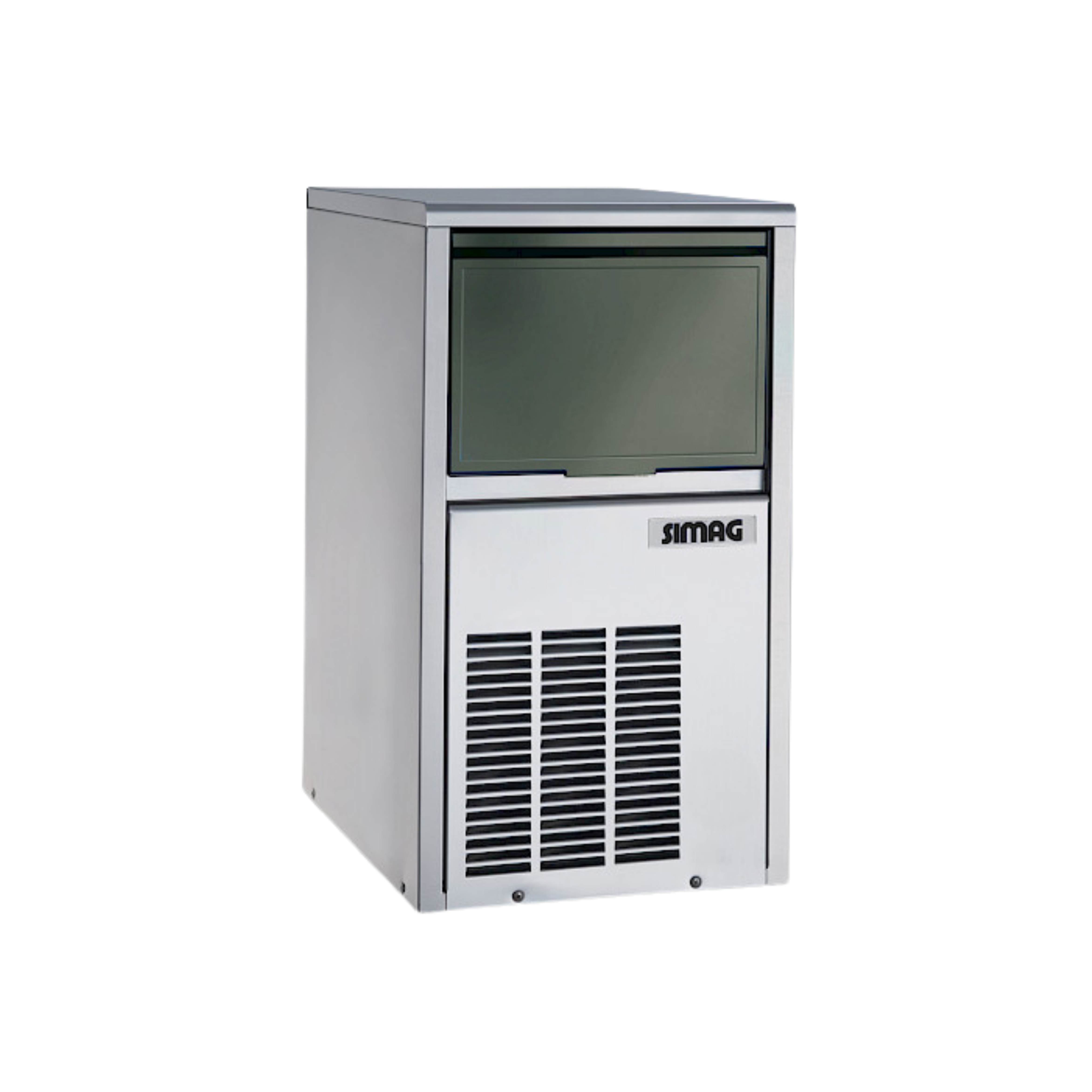 Finition inox. Groupe à air. Tension : 230/50/1 Production : 20 Kg/24 h. (1000 glaçons). Stockage : 6 Kg. (300 glaçons) glaçon Tronconique de 20 g. Régulation électromécanique.